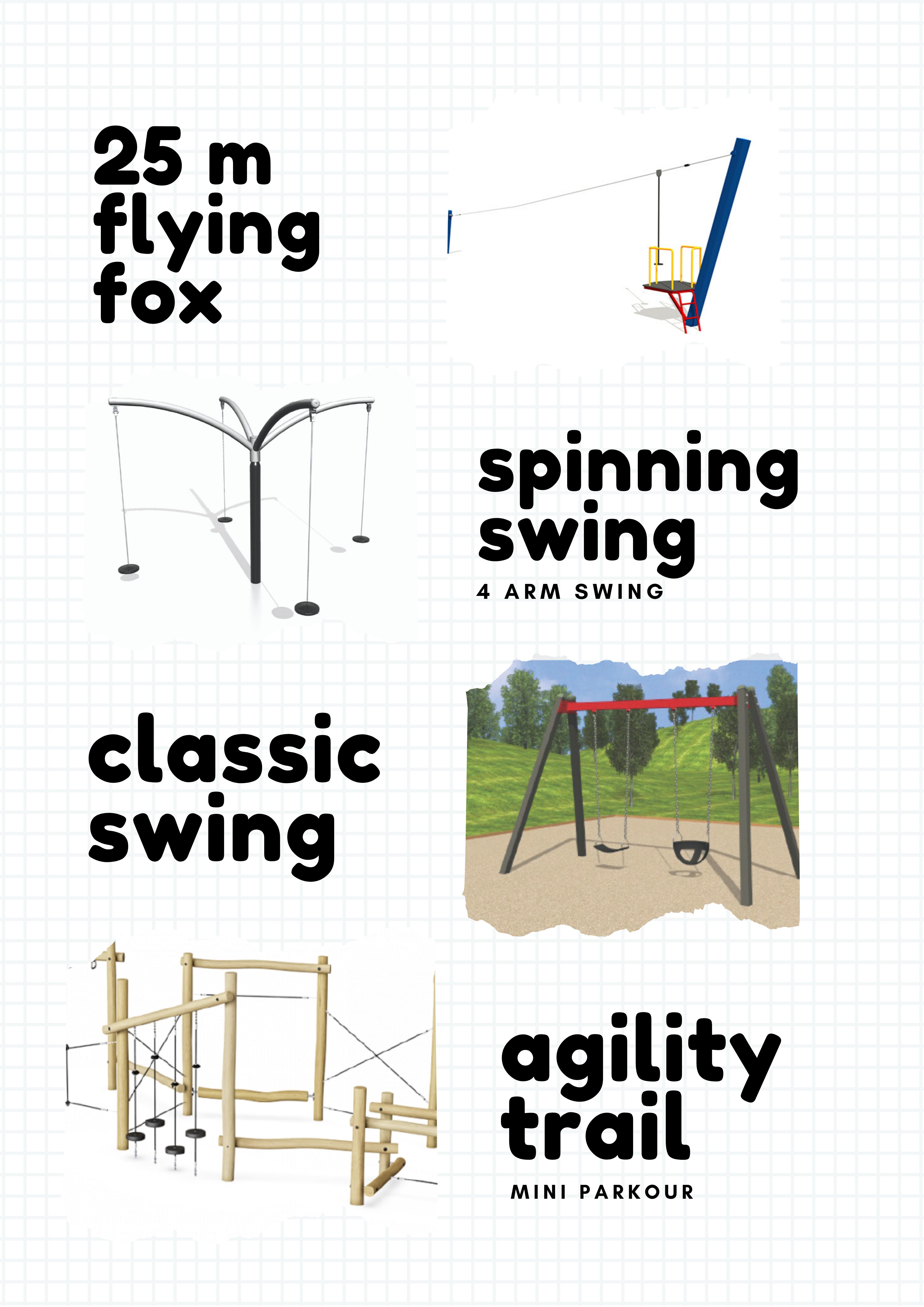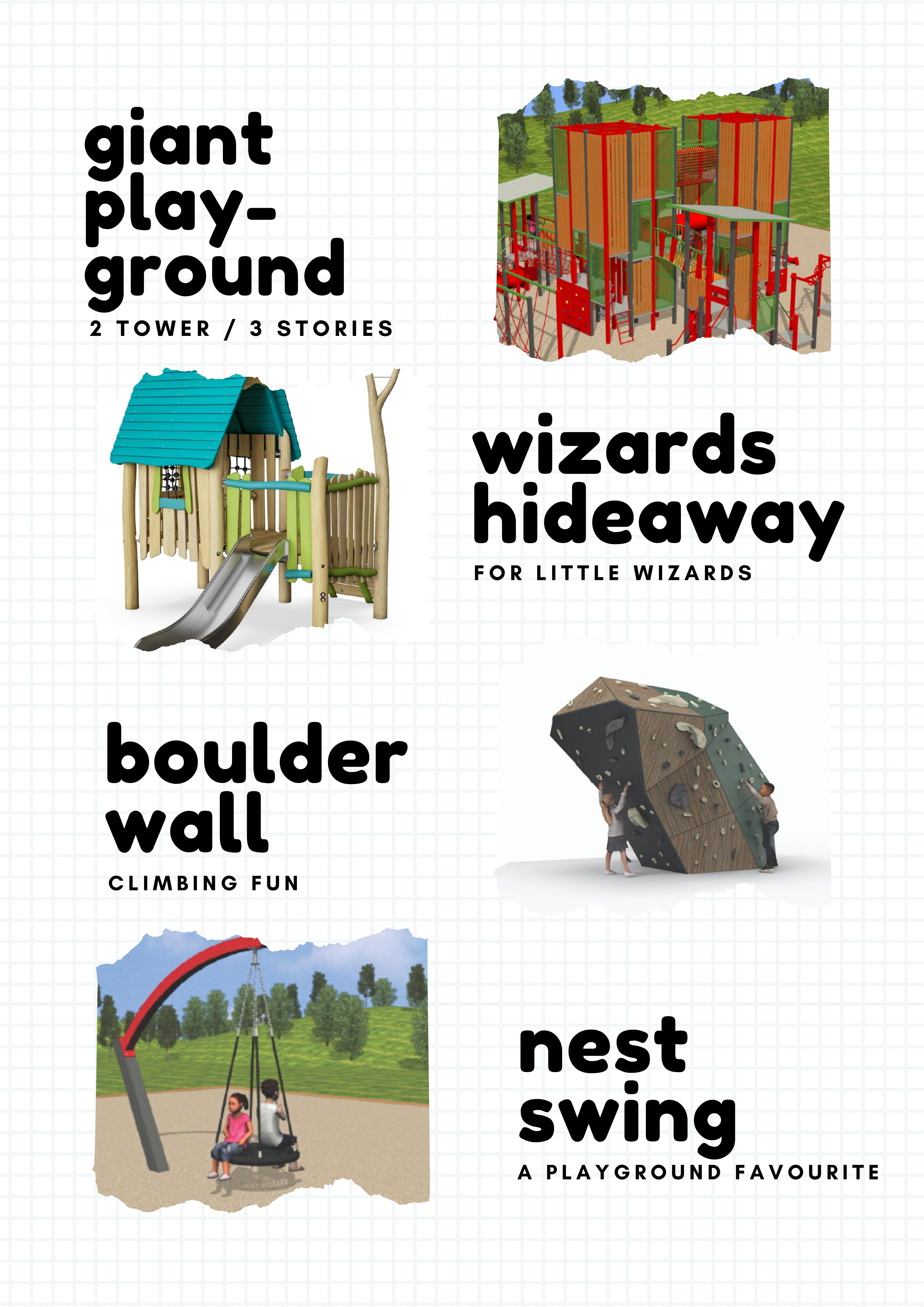 A two tower giant adventure playground, A 25m flying fox, agility trail, nest swing, wizards hideaway hut, boulder climbing wall and spinning four arm swing. Plus a series of wetlands, toilet facilities, BBQ and undercover area, scooter track, Basketball/Netball/Soccer court and new native plantings and stone arrangements. All of this will back onto a full size football oval for all to enjoy.